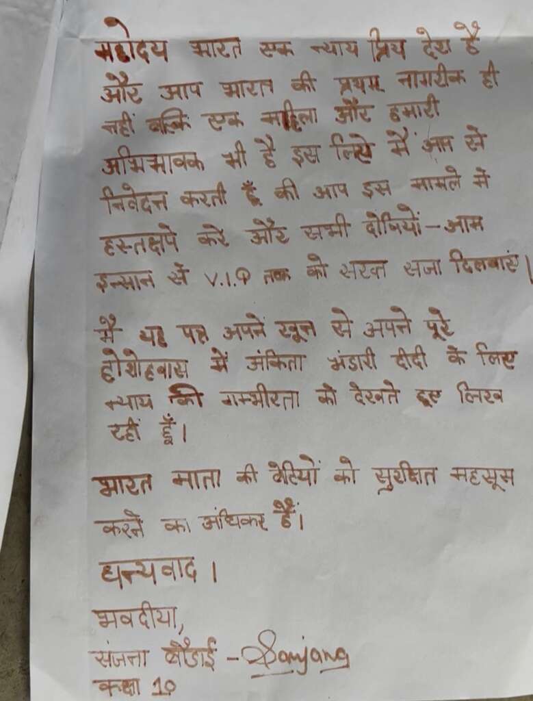 बड़ी बहन कुसुम लता बौड़ाई केवल एक आम नागरिक नहीं हैं। वह किसान मंच की प्रदेश प्रवक्ता होने के साथ-साथ पहाड़ों फाउंडेशन की अध्यक्ष भी हैं। सामाजिक आंदोलनों से जुड़ी कुसुम लता ने जब देखा कि अंकिता भण्डारी को न्याय दिलाने की हर संवैधानिक कोशिश अनसुनी होती जा रही है, तो उन्होंने विरोध का वह रास्ता चुना, जिसे देखकर पूरा समाज सन्न रह गया। अपने खून से लिखा गया यह पत्र उन्होंने “निवेदन” नहीं, बल्कि सत्ता के मुँह पर तमाचा बताया है।